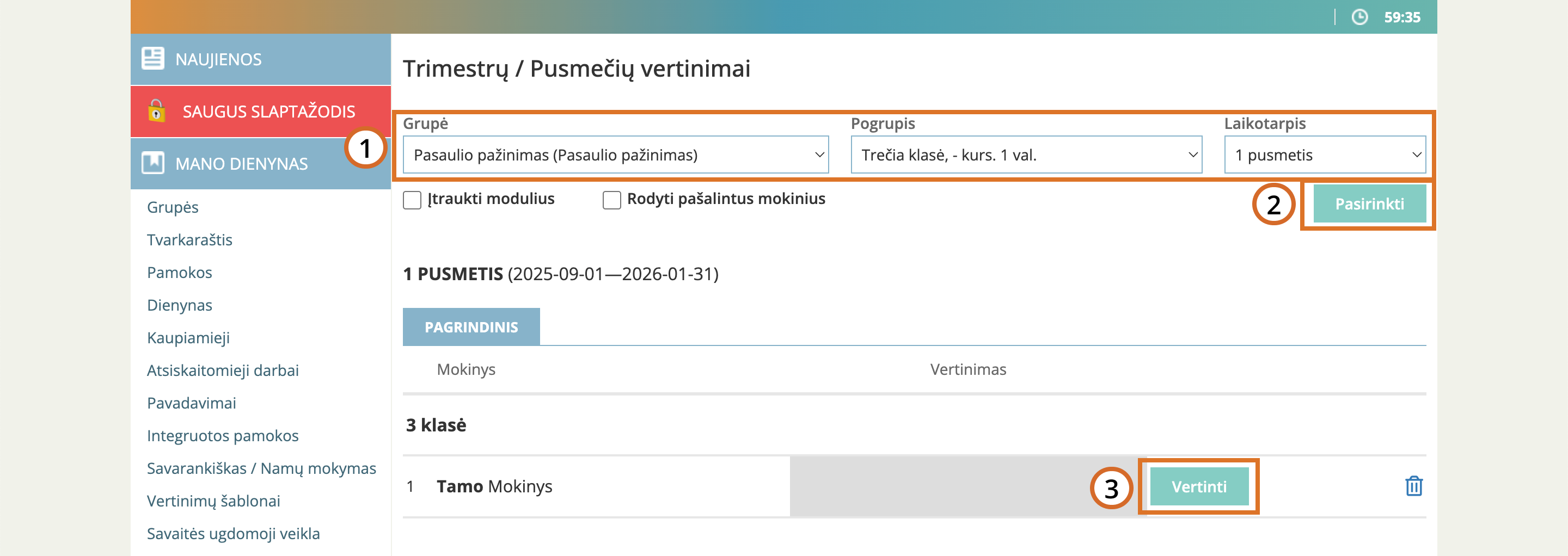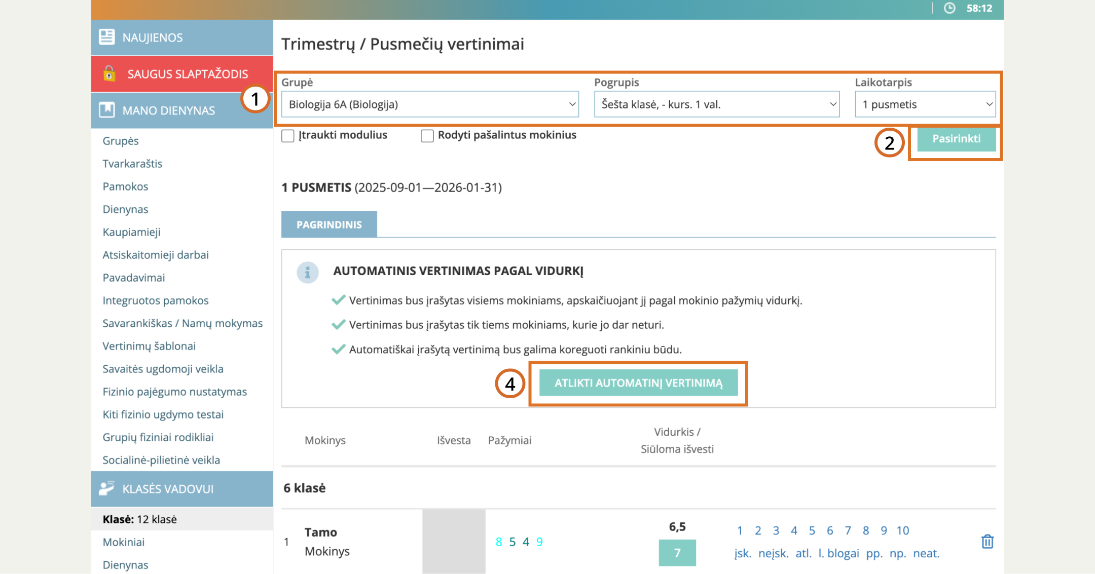 Laikotarpių vertinimus rasite skiltyje „Ataskaitinės veiklos“, meniu punkte „Trimestrai / Pusmečiai“.