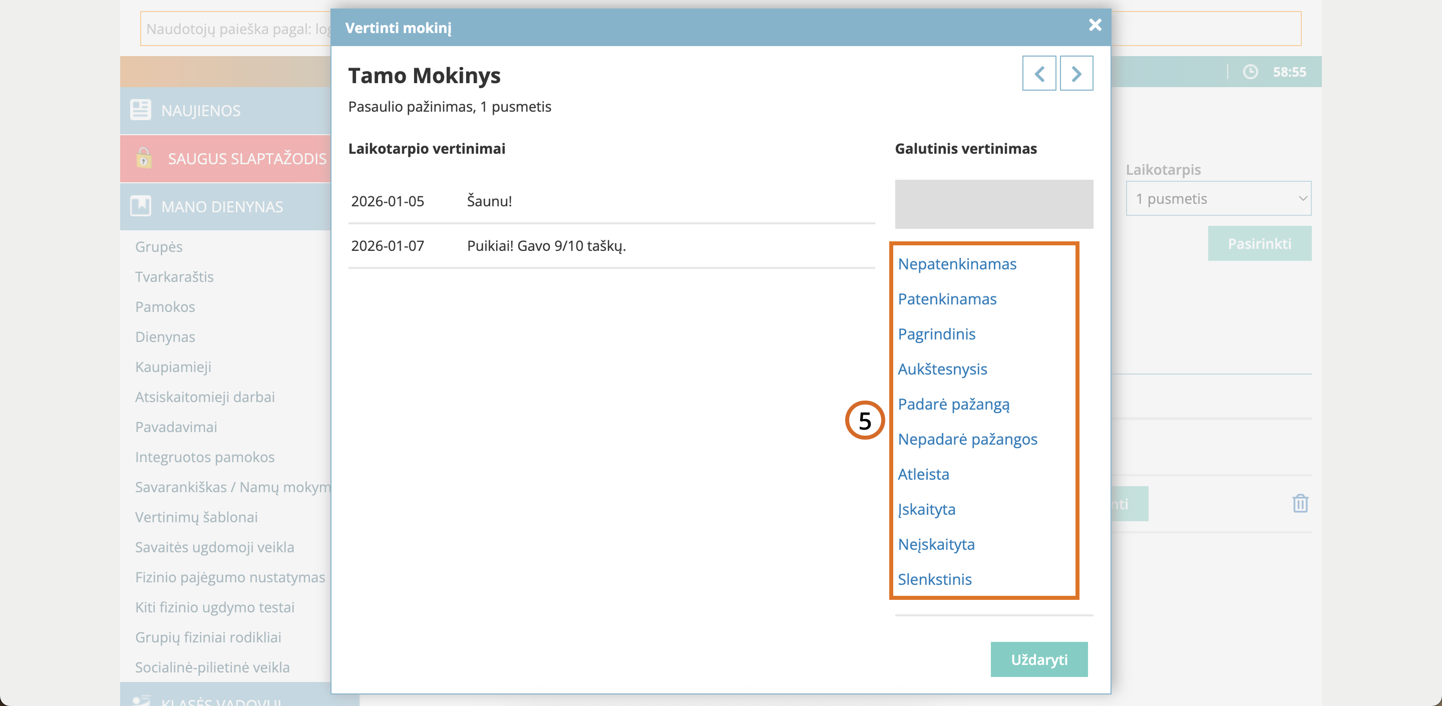 Atsidariusiame lange kairėje pusėje matysite mokinio laikotarpio vertinimus, dešinėje – galimus vertinimų pasirinkimus.