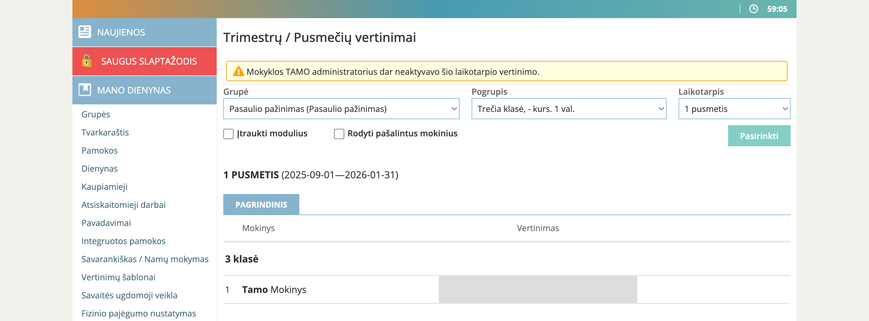 Jeigu, pasirinkus grupę ir laikotarpį, rodomas pranešimas „Mokyklos TAMO administratorius dar neaktyvavo šio laikotarpio vertinimo“, tai reiškia, kad reikia palaukti, kol TAMO administratorius aktyvuos laikotarpį, arba apie tai jam pranešti.