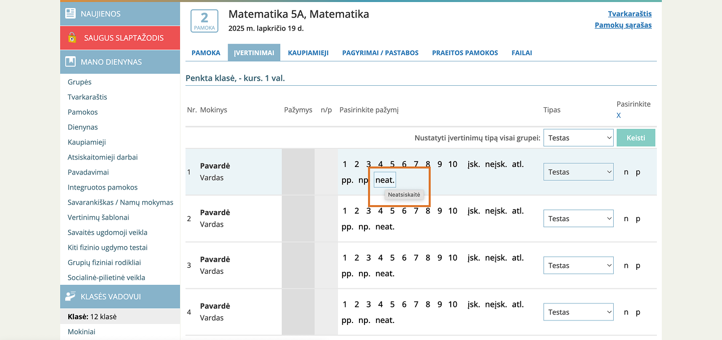 Įvedus įvertinimą neat., jis matomas tiek tėvams, tiek mokiniams, kaip ir visi kiti įvertinimai.