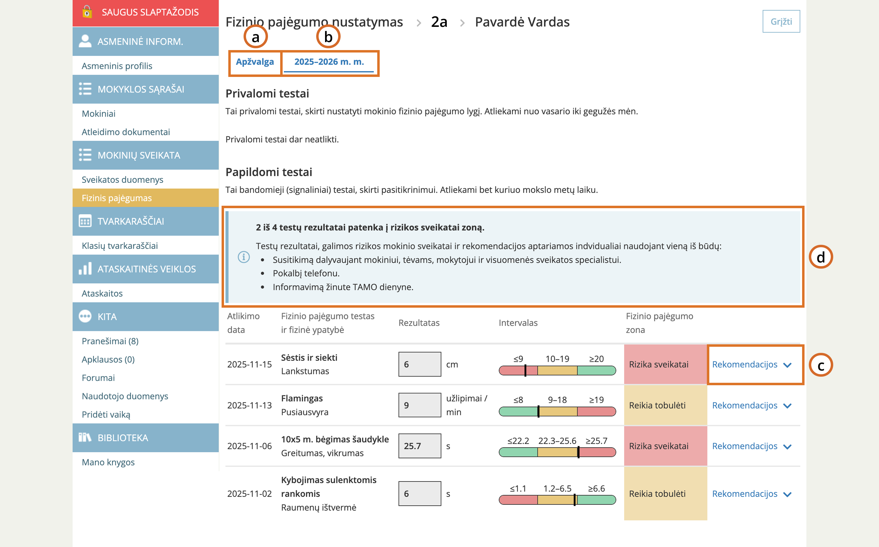 - Jei mokinio rezultatai patenka į „Rizikos sveikatai“ zoną, tai aiškiai nurodoma informaciniu pranešimu kartu su siūlomomis priemonėmis.