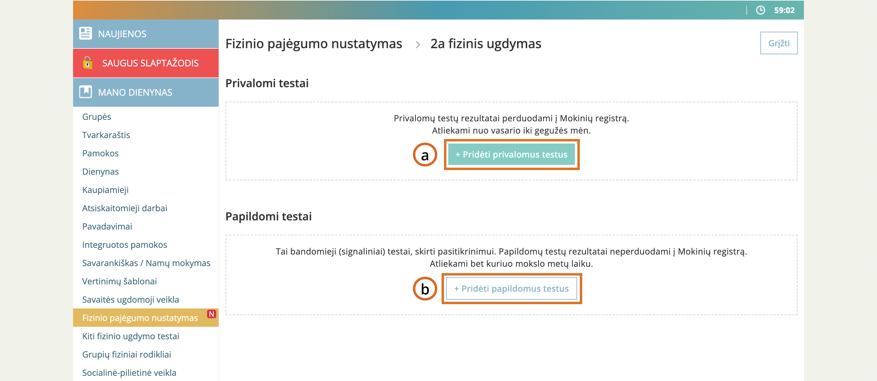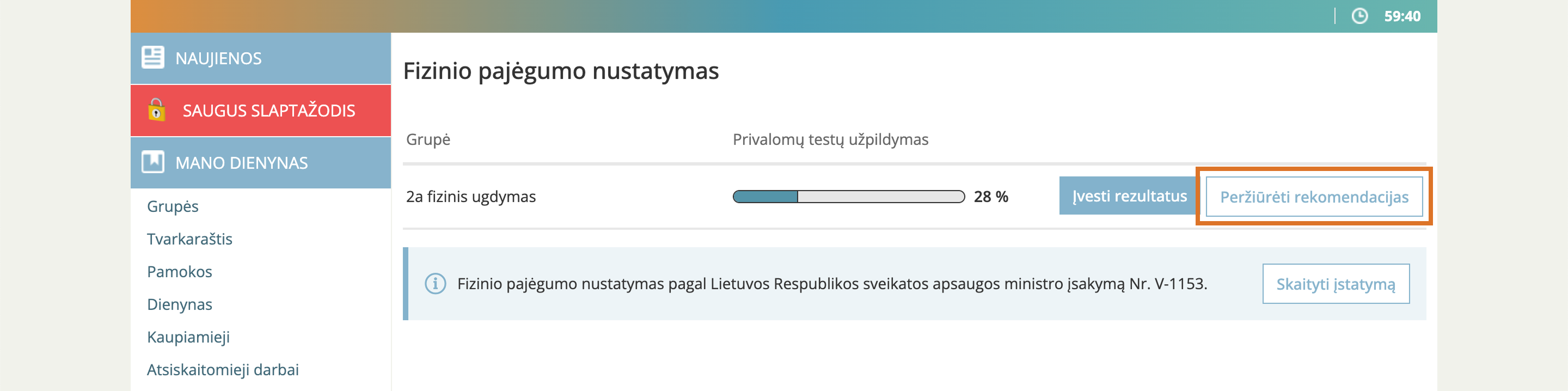 Fizinio pajėgumo nustatymą rasite skiltyje „Mano dienynas“, meniu punkte „Fizinio pajėgumo nustatymas“.