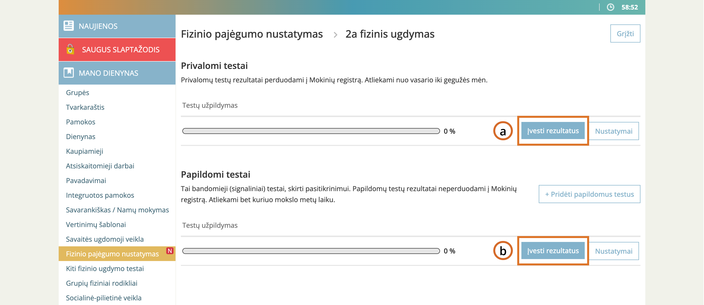 a) privalomus – privalomų testų blokelyje spauskite „Įvesti rezultatus“.