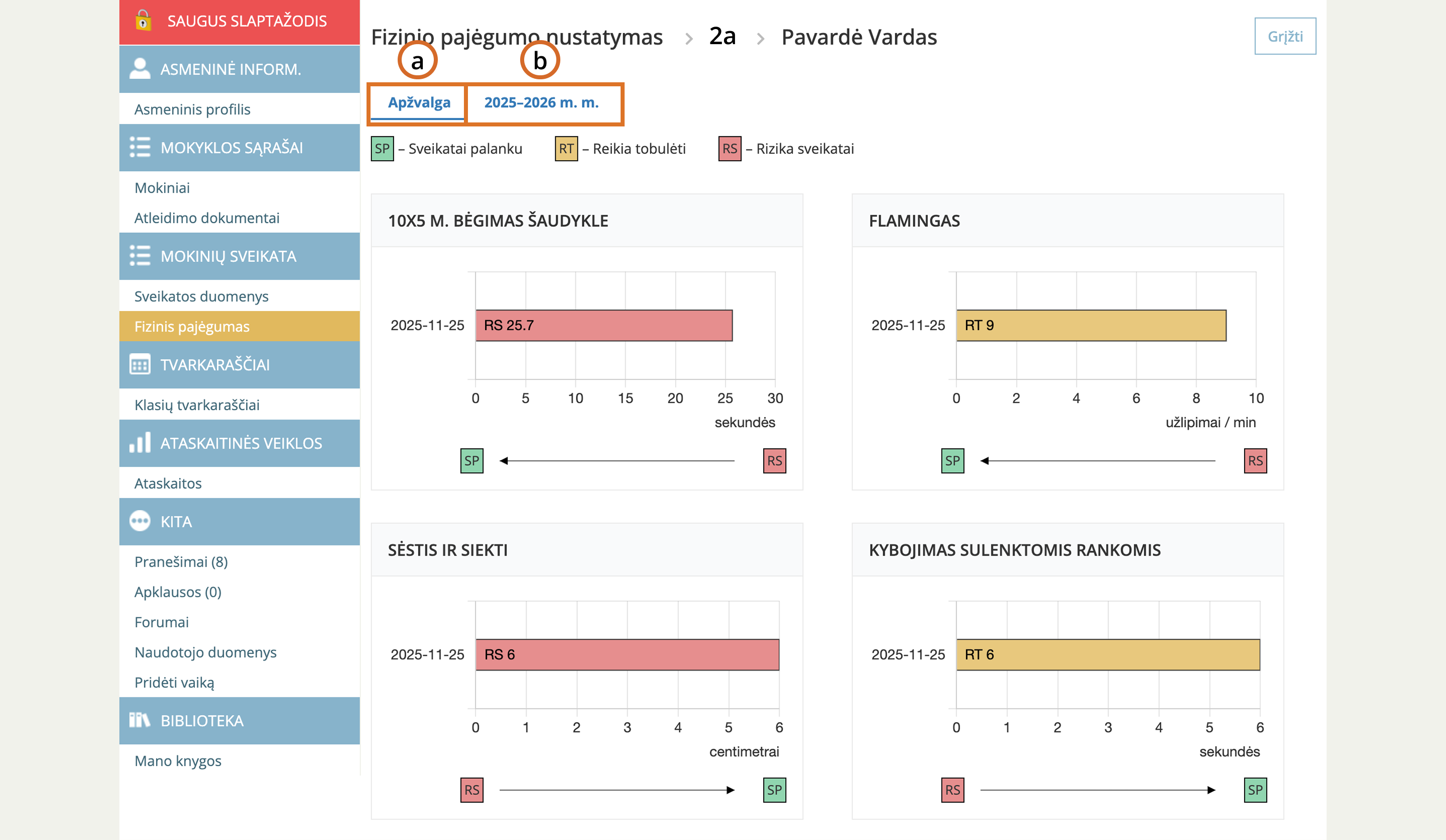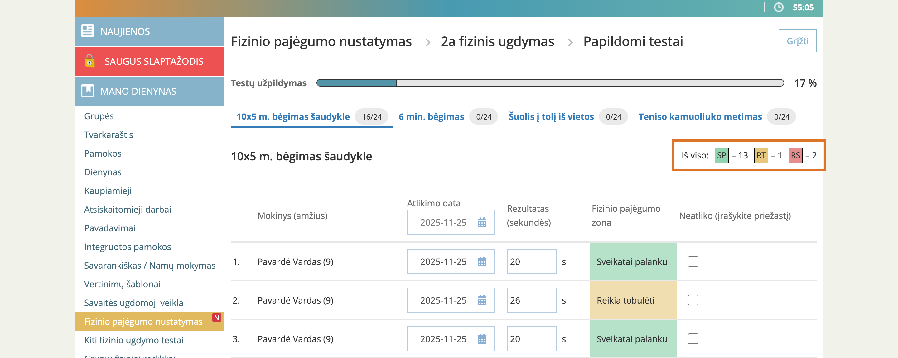 Ties testo pavadinimu, dešinėje pusėje, matysite suvestinę – kiek mokinių rezultatų pateko į skirtingas fizinio pajėgumo zonas.