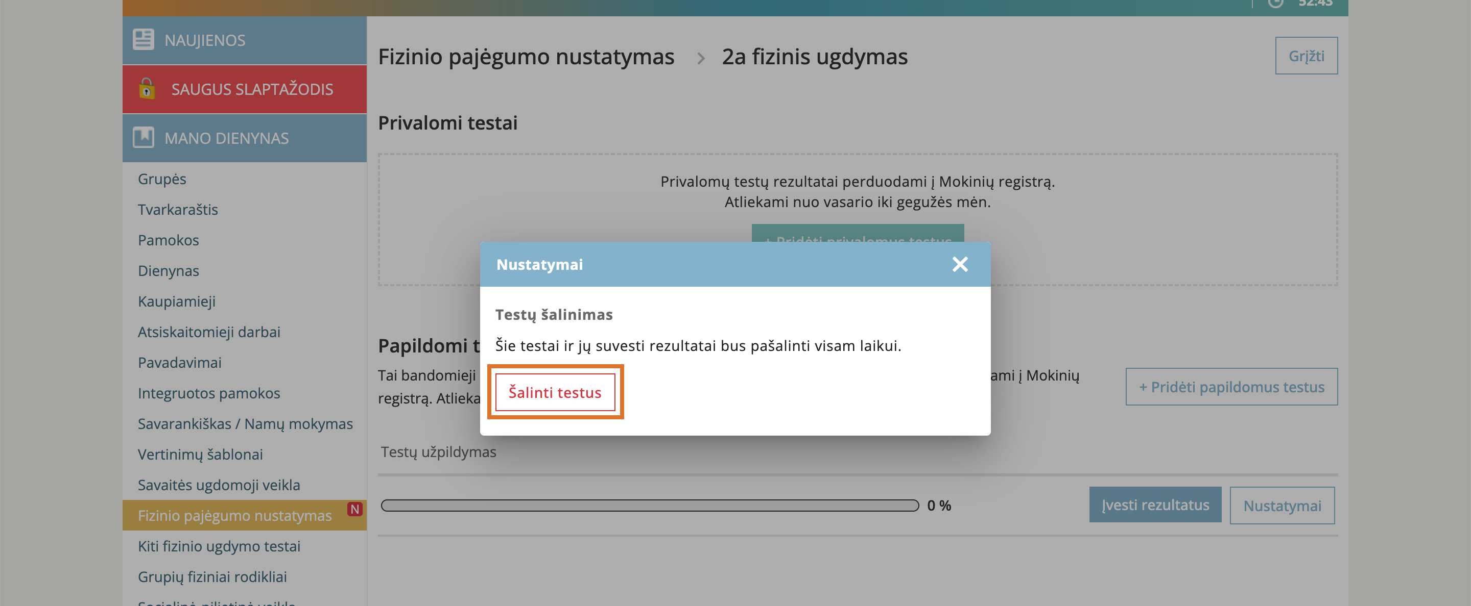 - Spauskite mygtuką „Šalinti testus“ (testai ir jų suvesti rezultatai bus pašalinti visam laikui).