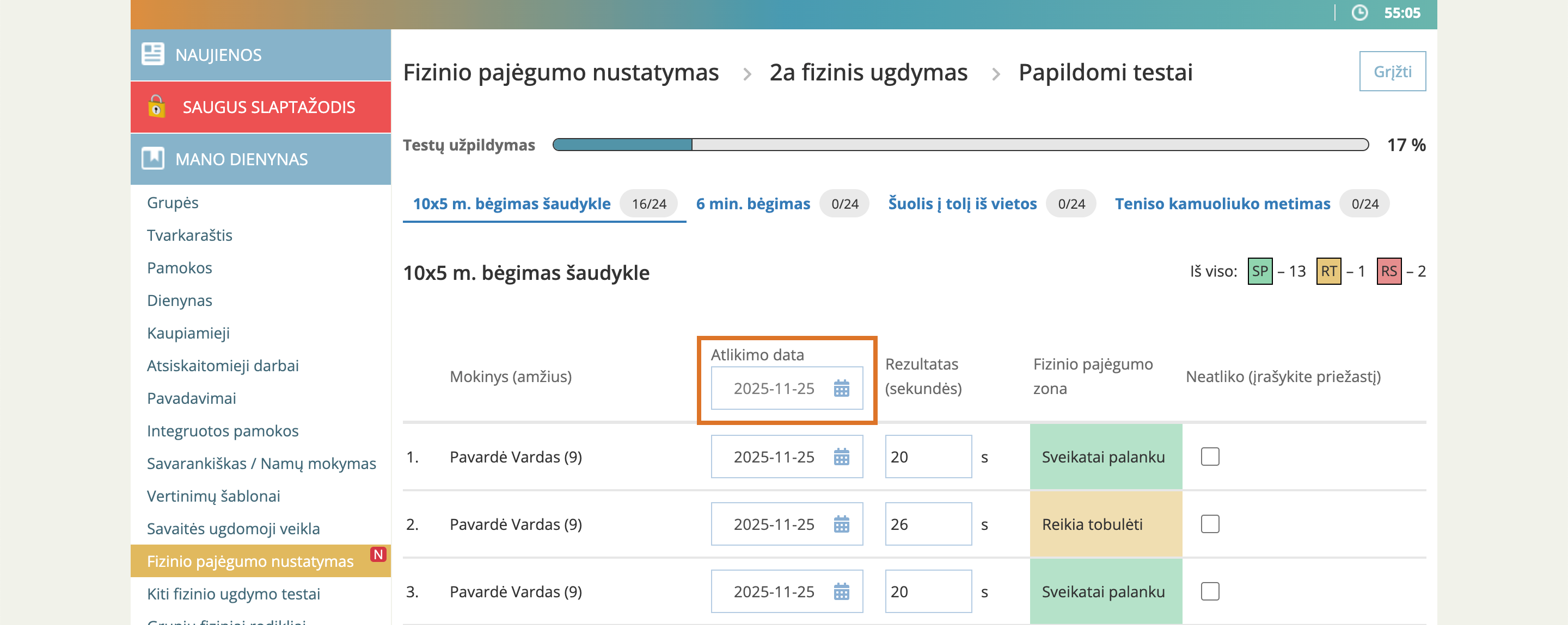 - Mokinio eilutėje įveskite rezultatą. Fizinio pajėgumo zona bus nustatoma automatiškai.