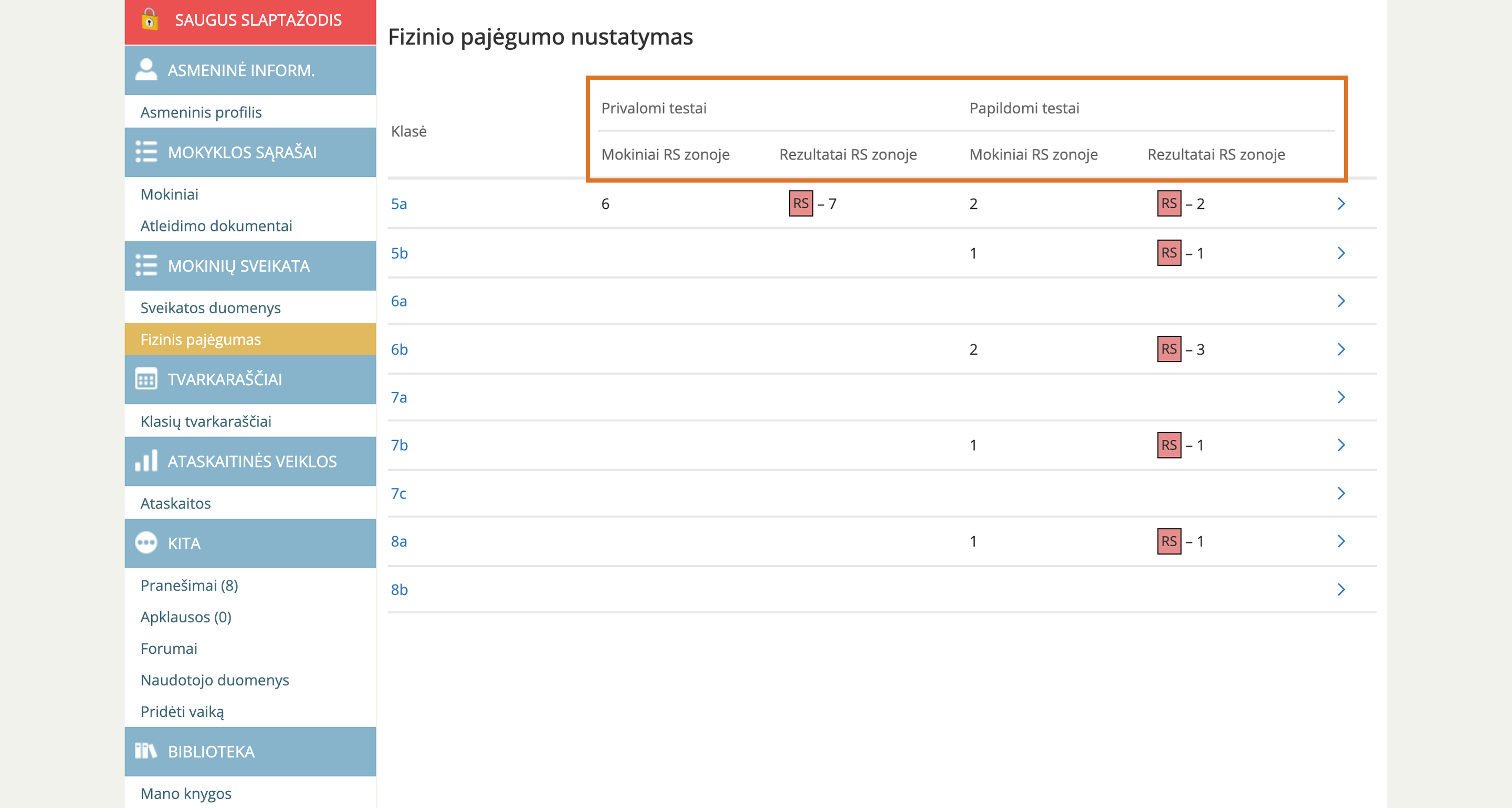 Visuomenės sveikatos priežiūros specialistas fizinio pajėgumo duomenis ras skiltyje „Mokinių sveikata“, meniu punkte „Fizinis pajėgumas“.
