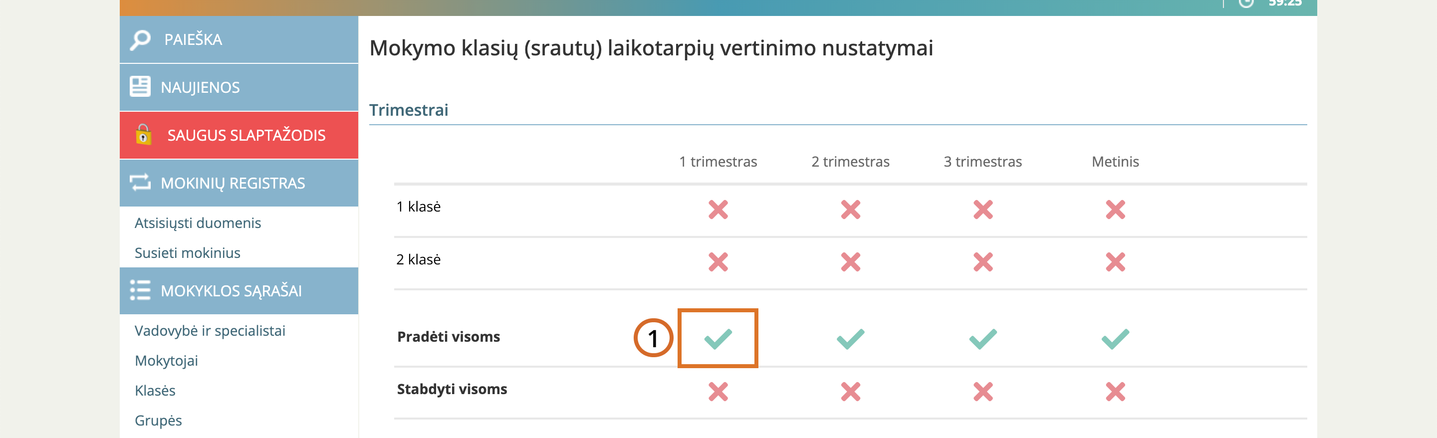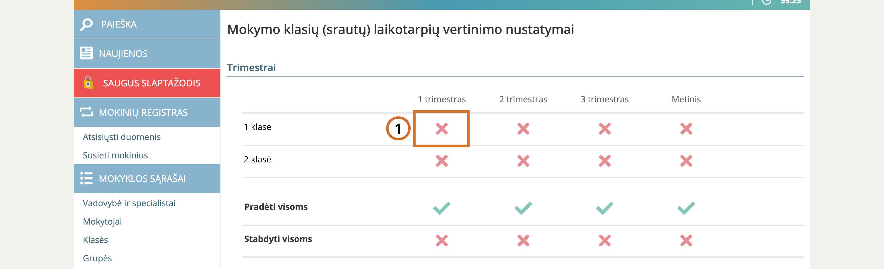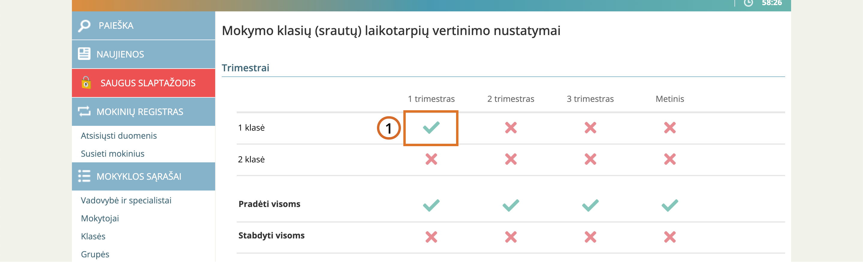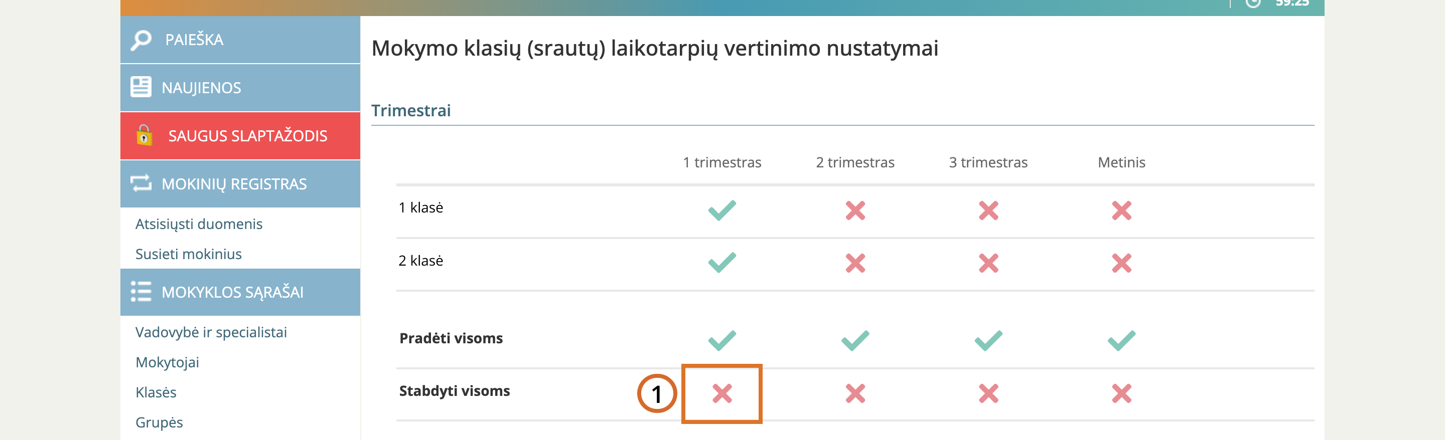 Prie pasirinktos klasės ir laikotarpio spauskite varnelės ikoną.
