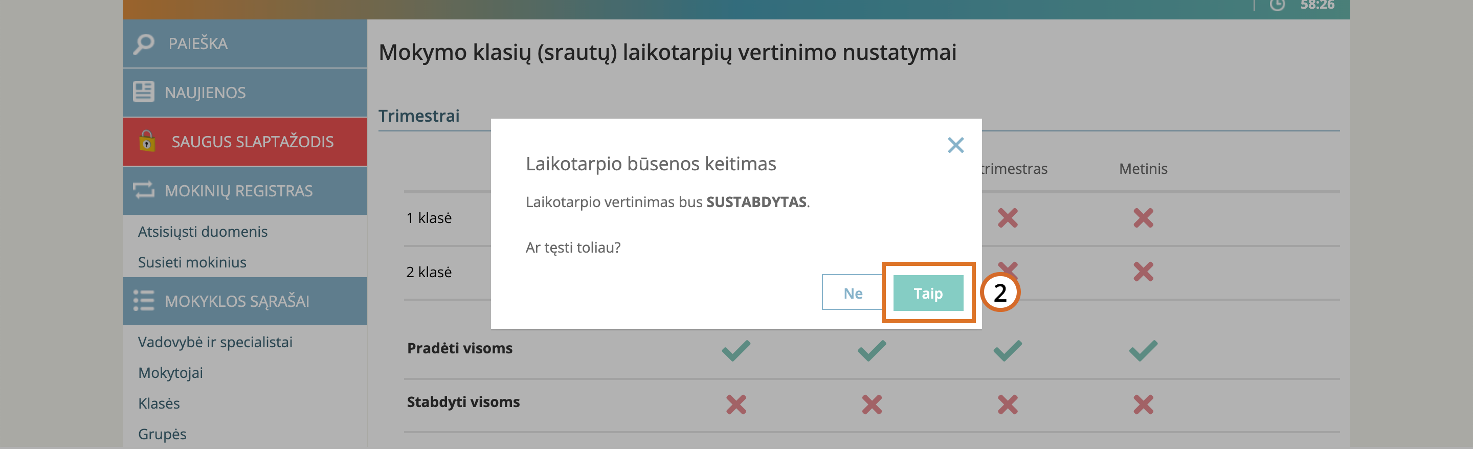 Laikotarpio vertinimo aktyvavimas / sustabdymas visoms klasėms