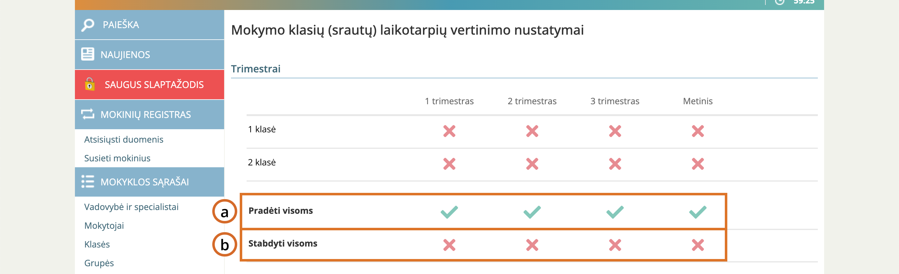 Klasių sąrašo apačioje, prie kiekvieno laikotarpio, pateikti du pasirinkimai: